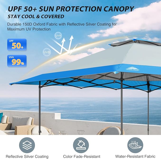 - VENTED TOP & AUTOMATIC EXTENDED EAVES: Stay cool with the EAGLE PEAK VENT that allows for greater airflow while you work or relax. The canopy’s automatically extending eaves open without any manual assembly and, combined with a sturdy straight-leg design, provides maximum coverage so 8 or more people can enjoy the spacious 169 square feet of shade. The easily adjustable telescoping 3-position steel frame is perfect for adjusting the canopy for your preferred coverage