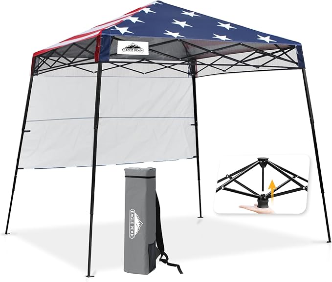 EAGLE PEAK 8x8 Pop Up Canopy Tent with Sidewall, Compact, Portable Slant Leg Instant Sun Shelter for Beach, Sports, & Camping, 8x8 Base 6x6 Top, American Flag