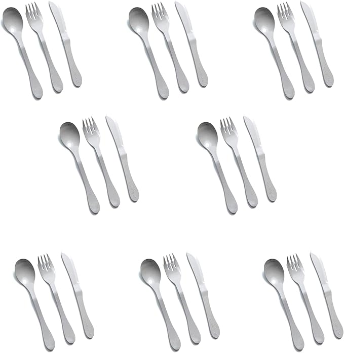 - 8 Eco Gray Spoons, 8 Eco Gray Knork forks, 8 Eco Gray Dual Purpose Knife