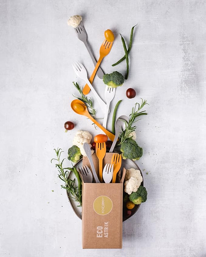 - Knork ergonomic design and beveled tines easily cut through food with one hand. Make the switch from single-use plastics that are clogging up landfills and our oceans.