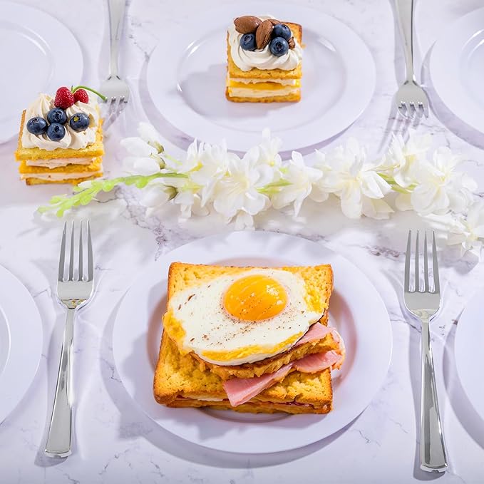 - HARD PLASTIC: 7.5” white disposable salad plates with silver forks are made of food grade hard plastic, 100% BPA free and non-toxic