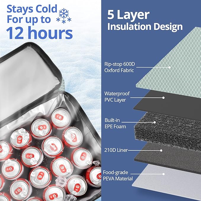 - STAYS COLD LONGER - Thoughtful 5 layer insulation design. Exterior surfaces are made of rip-stop 600D Oxford materials plus one layer of waterproof PVC. Interior layers are thicker, reinforced food-grade PEVA materials with seamless ultrasonic welding for 100% leakproof and tear-resistance. A built-in EPE foam middle layer and 210D liner add additional insulation, allowing the Maelstrom Icy Hollow Soft Sided Cooler Bag to keep food or drinks cold for up to 12 hours.