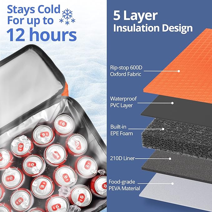 - STAYS COLD LONGER - Thoughtful 5 layer insulation design. Exterior surfaces are made of rip-stop 600D Oxford materials plus one layer of waterproof PVC. Interior layers are thicker, reinforced food-grade PEVA materials with seamless ultrasonic welding for 100% leakproof and tear-resistance. A built-in EPE foam middle layer and 210D liner add additional insulation, allowing the Maelstrom Icy Hollow Soft Sided Cooler Bag to keep food or drinks cold for up to 12 hours.