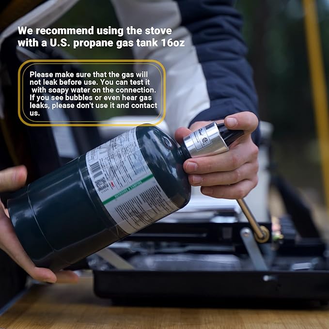 - NOTICE:Please make sure that the gas will not leak before use. You can test it with soapy water on the connection.