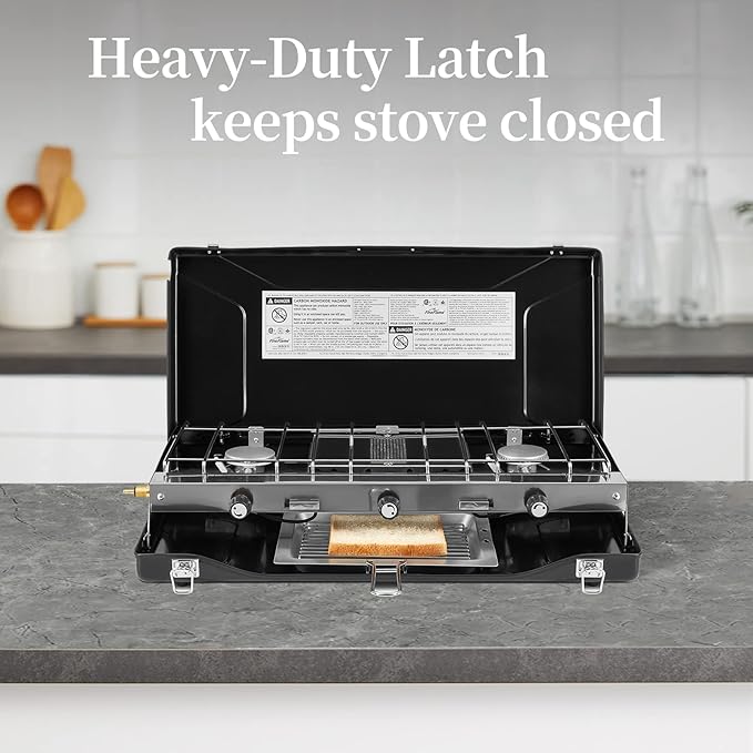 - ADJUSTABLE 3 BURNERS : This camping gas stove is equipped with 3 independently adjustable knobs, two of Piezo ignition burners with 6,600 BTU power. The middle downward burner is designed for toasting, 7200BTU power and requires manual ignition. We recommend that you use a piezo lighter. It relies on heat radiation to heat and won't burn the toast