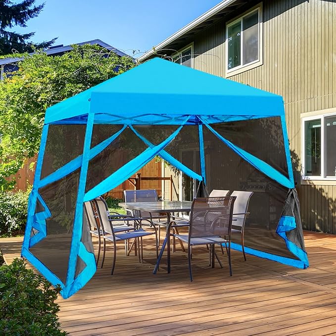 EAGLE PEAK 10x10 Slant Leg Easy Setup Pop Up Canopy Tent with Mosquito Netting 64 sqft of Shade, Light Blue