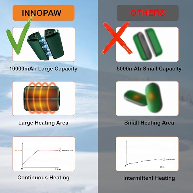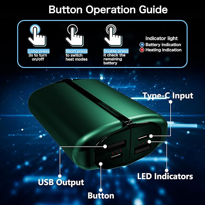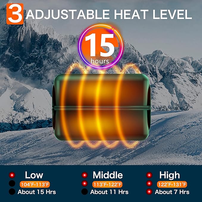 - 3 DIFFERENT HEAT SETTINGS - 3 levels of temperature heating warms your both hands.Fast heating up in 3 seconds.Battery and heat indicator lights will show you the selected heat settings and battery remaining.