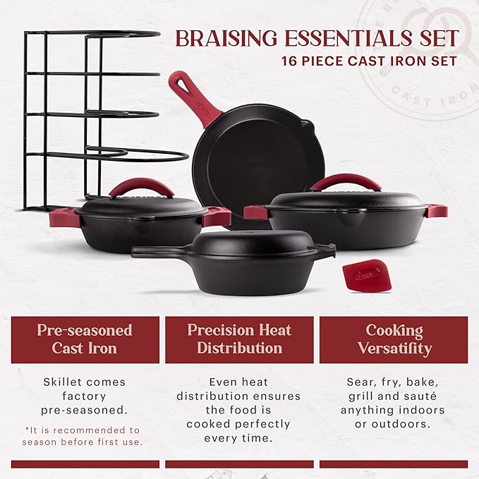 Cuisinel Cast Iron 16-Piece Pre-Seasoned Cookware Set - 8" + 12" Braiser Pans + Cast Iron Lids + 10" Skillet + 2-in-1 Multi-Cooker + 12" Organizer + Scraper + Silicone Handle Covers - Fire or Oven Use