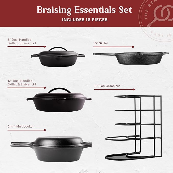 - BRAISING ESSENTIALS SET: 8" and 12"-inch Dual Handle Braiser/Skillets with Cast Iron Lids + 10" Skillet + 2-in-1 Multi-Cooker + 12" Panrack + Silicone Handle Grips for everything AND Pan Scraper for easy clean-up: This essential set can handle all your frying, searing, baking and braising needs.