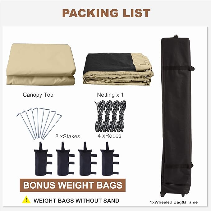 - ✅Package Includes: 1 Canopy Frame, 1 Canopy Top, Mosquito Netting, 4 Sand Bags, 4 Ropes, 8 Stakes and 1 Wheeled Bag, which is crafted of 600D PVC coated fabric with reinforced handles.