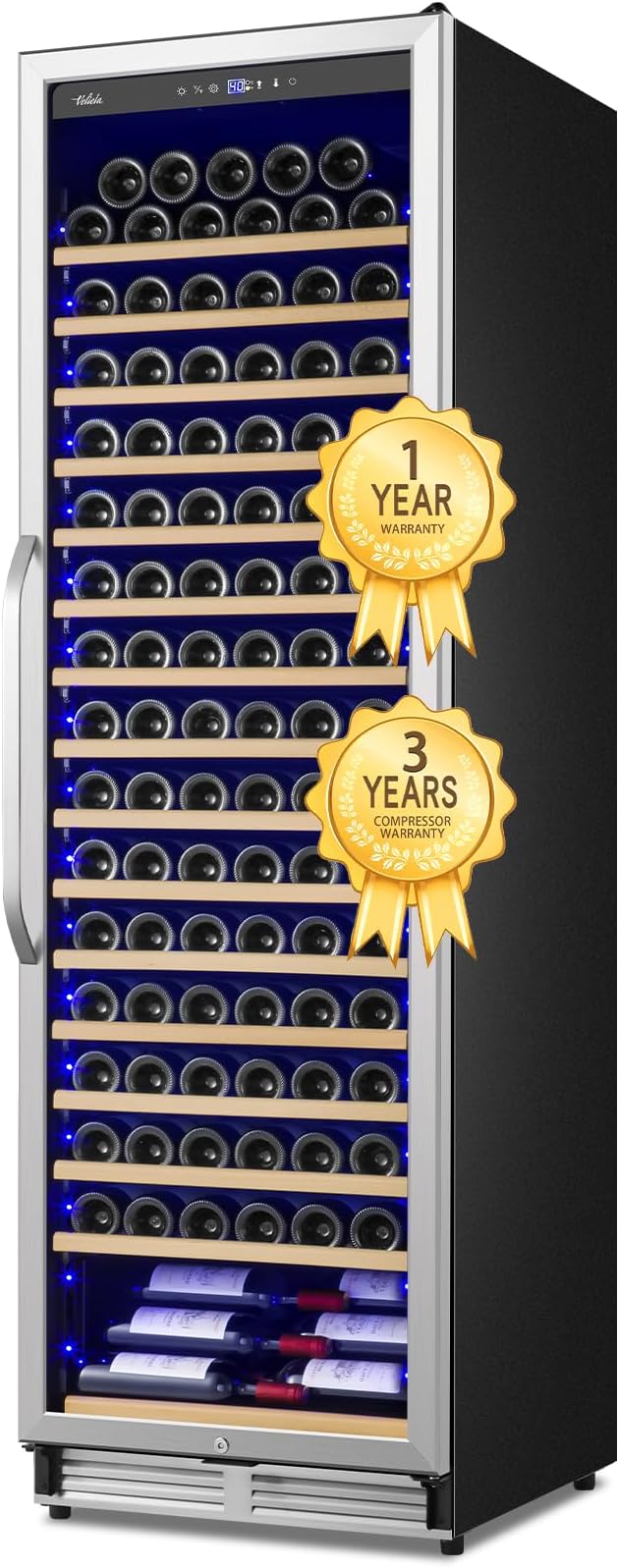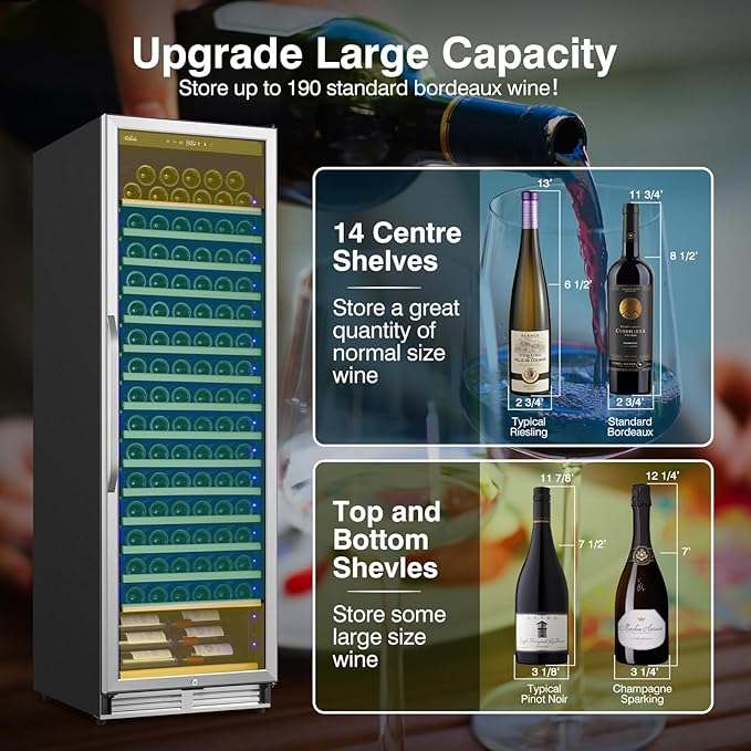 - 【Upgraded Large Capacity-Up to 190 Bottles 】 The 24-inch tall wine cooler has spacious upgraded storage for the red wine collections. Besides the wine fridge has two large space shelves for the larger bottles, like Pinot or Champagne. It's the perfect choice for the wine lover to put their collection