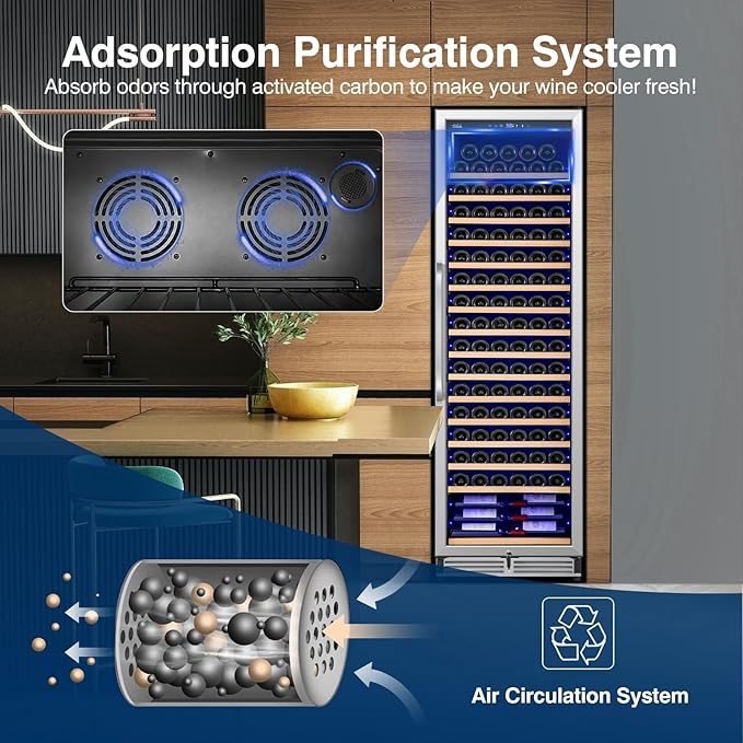 - 【Safety Lock & Carbon Purification System】 The wine cooler is equipped with a safety lock that can effectively protect your collection when needed. The wine fridge has a Carbon Purification System system which could Absorb and purify odor in the cooler, making it fresh