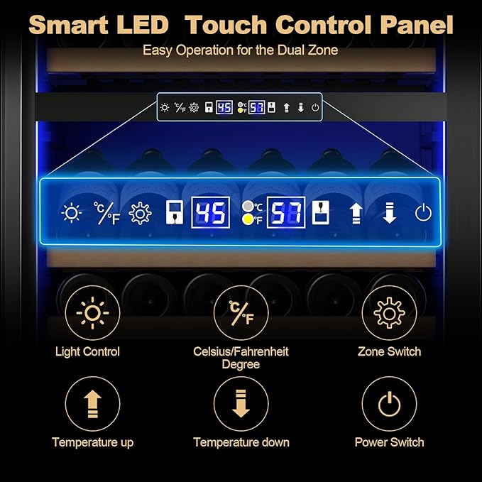 - Smart Control Panel & Blue Ambient Lighting:The intuitive LED touchscreen offers precise temperature adjustment while soft blue ambient lighting protects wine tannins - creating the perfect showcase for your wine cooler fridge.