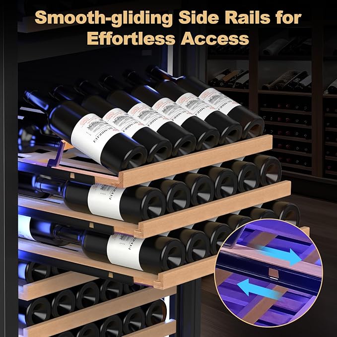 - Spacious 179-Bottle Capacity:This spacious 24-inch wine refrigerator accommodates 179 standard Bordeaux bottles with 12 premium beechwood shelves, including 2 display shelves with elegant bottle holders to showcase your prized collection. Smooth-gliding side rails provide effortless access.