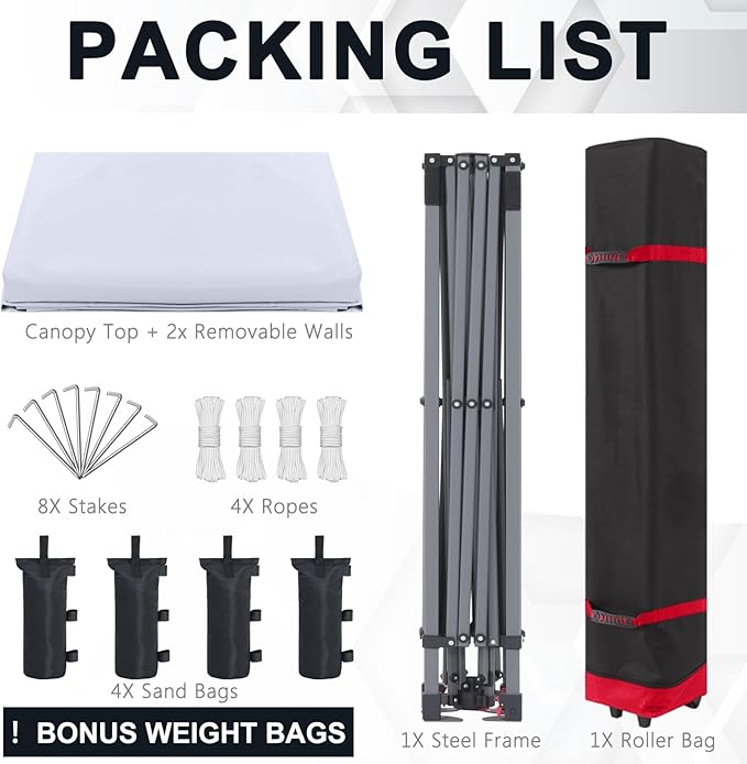 - 【PARTS INCLUDED】Fully assembled powder-coated steel frame,oxford fabric silver coated canopy top,2 Removable Side Walls,600D heavy stock wear resistant roller bag,4Xsand bags,8Xstakes and 4Xropes