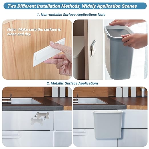 - Two Installation Options - Come with two different installation methods accessories. The first one is a strong magnetic holder, which can easily attach to metal surfaces. The second one is an adhesive patch and hook, you can stick it anywhere you want after rip off the adhesive strip, then easily hang the trash can.
