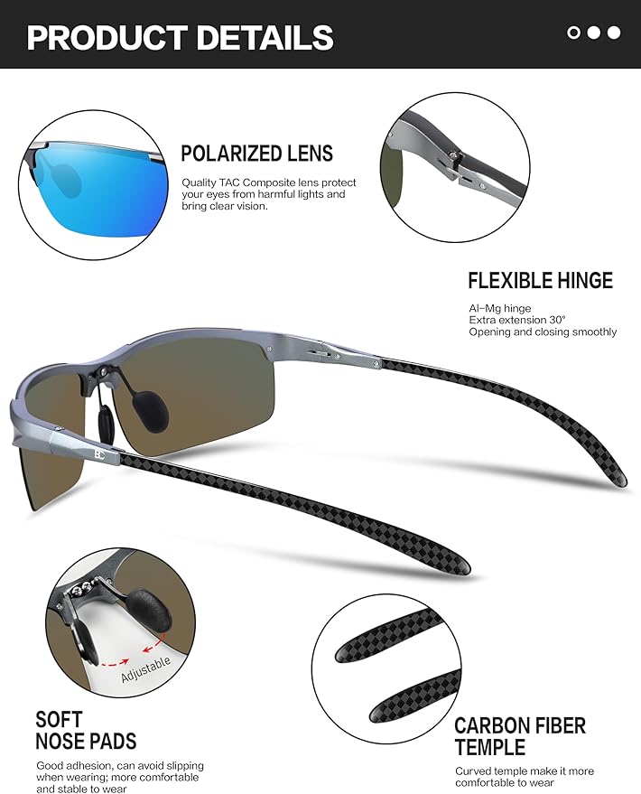 - 【Carbon Fiber Temple +Al-Mg Frame】: the fashion sunglasses is 22.5g, which is 20% lighter than ordinary metal shades,.carbon fiber temple is ultra-light, anti-corrosive and skin-friendly ,Al-Mg metal frame is durable,full of texture as well as lightweight , so it's a perfect pair of mens sunglasses for outdoor accasions.