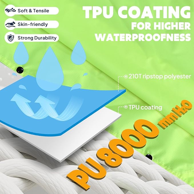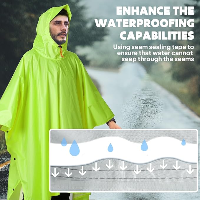- Waterproof and Sturdy Material: The rain poncho is made of 210T ripstop polyester + TPU coating, this rain poncho is PU8000MM waterproof.To enhance the waterproofing capabilities of a rain poncho,we use techniques such as seam sealing or taping to ensure that water cannot seep through the seams.It comes with a drawstring hood, hook and loop fasteners along the sides ensures the optimal fit,which is good for protecting your head and face.