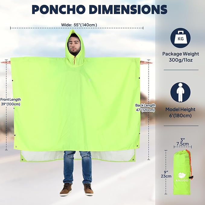 - Lightweight and Easy to Carry: This unisex rain poncho from Anyoo gives you maximum coverage when you need it, plus easily folds into a compact size,making them easy to carry in a bag or backpack. It can be stored away into the bag as a sort of emergency rain jacket and taken out and worn when needed. You can carry it around with you with ease saving you from carrying around a bulky raincoat. Weighs only 11 oz.