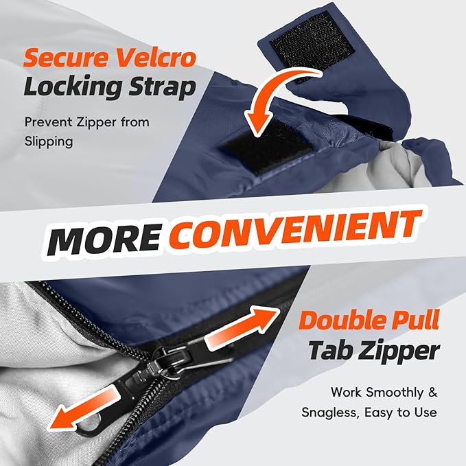 - EXCELLENT DESIGN : The double pull tab zipper on the right side makes it easy for you to open and close from inside or outside, work smoothly & snagless. The zipper at the bottom lets you ventilate the foot section for better temperature control. On warm nights, unzip it and use like a blanket