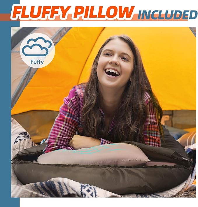 - SLEEP COMFORTABLY WITH PILLOW : A 220 G plush filling camping pillow is included for an at-home sleep experience in the outdoors. Contoured 3D hood construction with drawstrings allows internal adjustment to avoid heat loss while providing space for the pillow; Reversible locking antisnag zipper and draft tubes backing it work together to keep body heat in