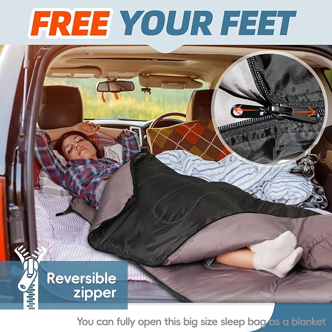 - GET MORE SPACE : Roomy rectangular shape comfortably fits most campers up to 7 FEET. Size: 33.5 by 90.5 inches (W x D), 20% larger than most products on the market, so lofty and wide you'll have plenty of room to stretch out. The separated bottom zipper lets you ventilate the foot section for better temperature control, you can even fully open this big size sleep bag as a blanket