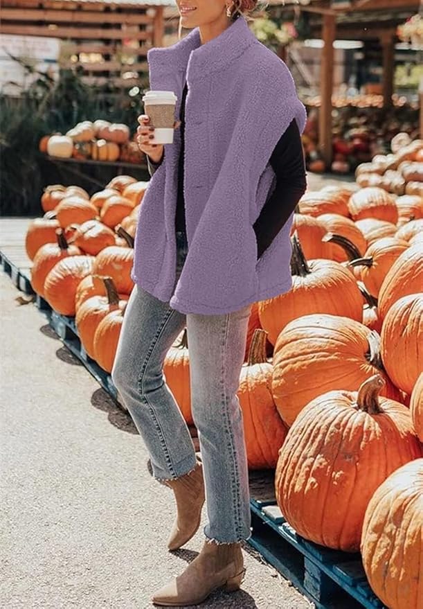 - Features: Stand collar, sleeveless, thigh-length, baggy style, side pockets, solid color, sherpa vest for women, casual loose fleece vest for women