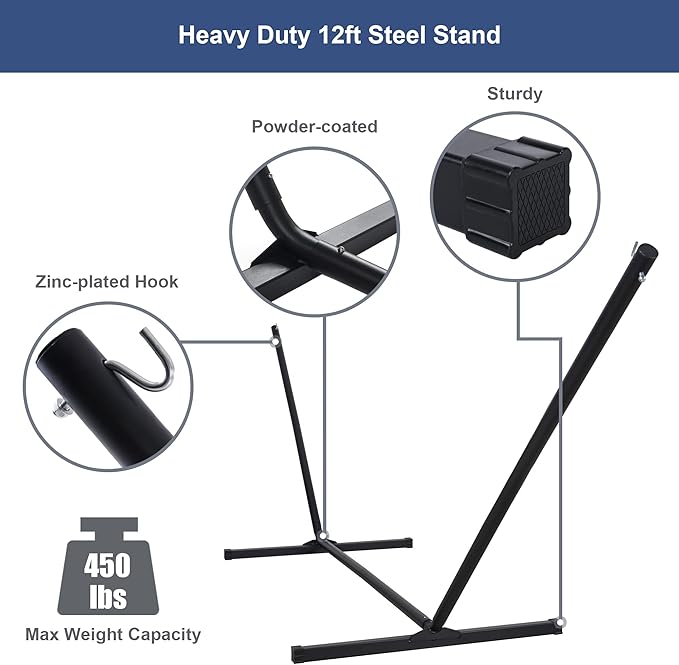 - Durable Frame: The portable hammock stand is made of heavy duty powder coated steel tube which will extend the service life of your freestanding hammock. And it is stable to support up to 450 lbs. You may protect the environment from choosing a hammock with stand, cause it does not require tree straps and will not harm trees