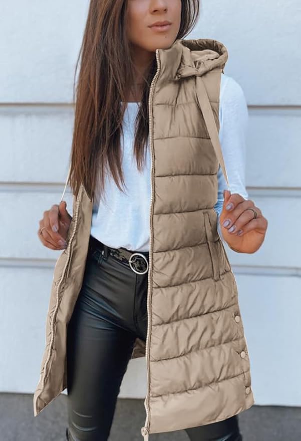 Veatzaer Women Long Vest Solid Color Sleeveless Hood Winter Puffer Vest Outwear