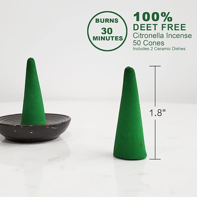 Citronella Incense Cones (50 Cones) with 2 Ceramic Dishes, 30 Min Burn Time, Plant Based Ingredients
