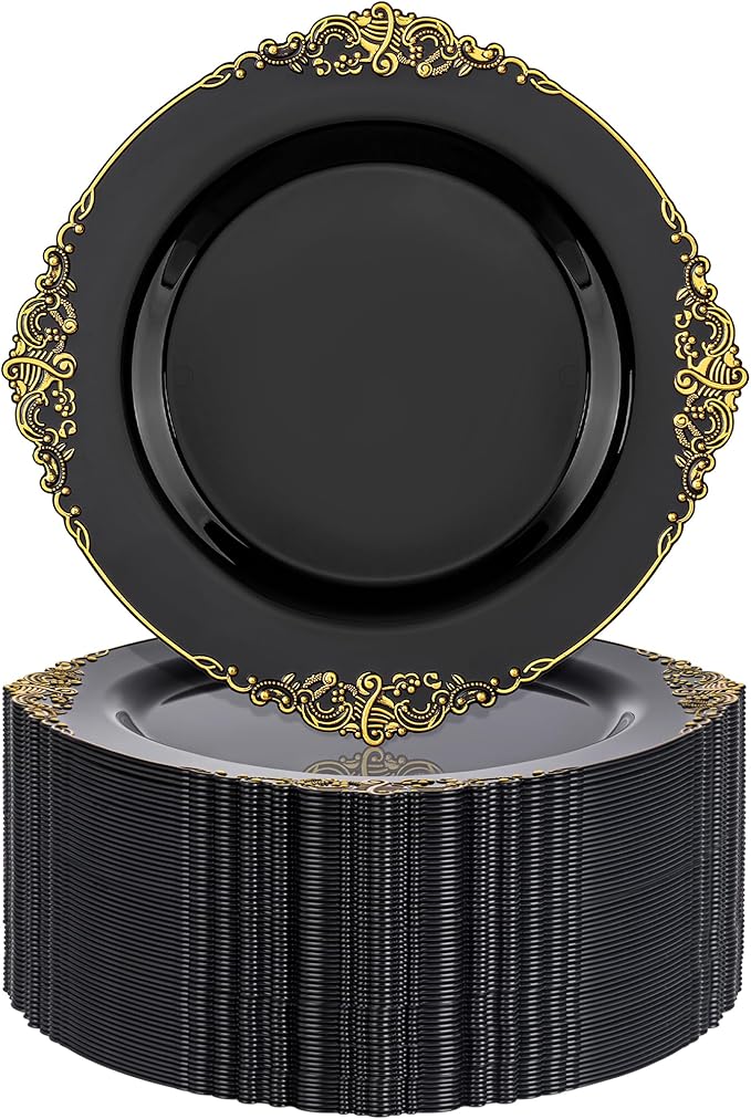 - All-inclusive Silverware SetALL - In the face of a large party of 100 people, you don't have to worry about insufficient black gold plastic plates . There are 100PCS 7.5-inch black gold plastic plates in the package, which can prepare a rich and satisfying Party & dinner for 100 guests. Black gold dessert plates are suitable for large parties and dinners