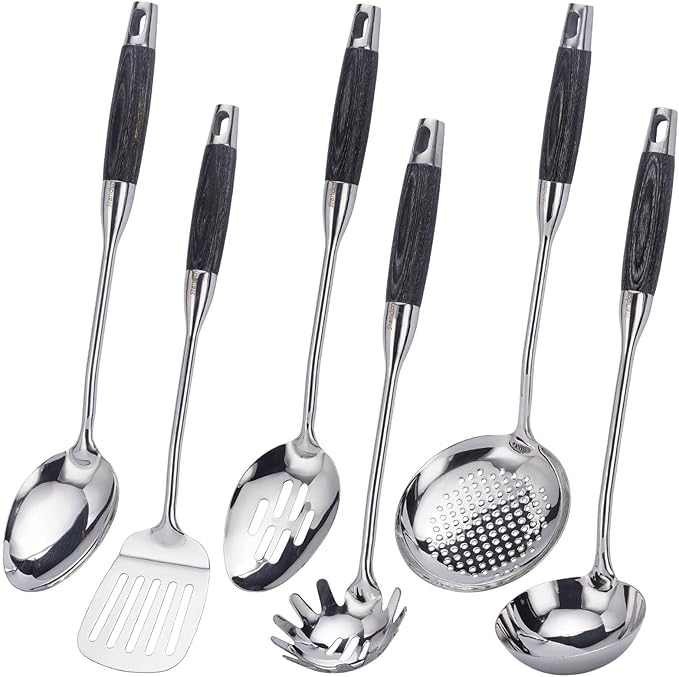 - 【Versatile Cooking Spoons Set】: 6 Pieces - 1 solid serving spoon, 1 slotted serving spoon, 1 skimmer spoon, 1 slotted spatula tunner, 1 pasta spoon, 1 soup ladle. And they pair perfectly with stainless or carbon steel cookware, a great gift for friends and family who love cooking with premium metal kitchen utensils