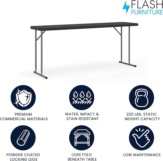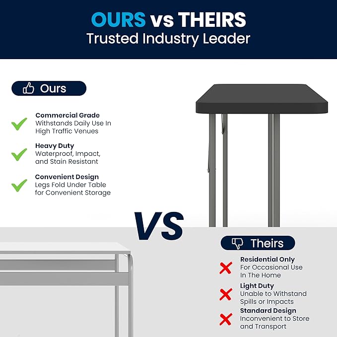 - DURABLE CONSTRUCTION: 1.75" waterproof plastic tabletop and powder-coated locking legs withstand years of quality use in indoor or outdoor settings and can support up to 220 lbs. of static weight