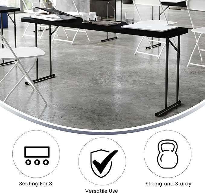- 6' RECTANGULAR FOLDING PLASTIC TABLE: Provides functional space for training rooms or classrooms and comfortably seats up to 3 adults on one side while allowing each person a clear view of the board and instructor
