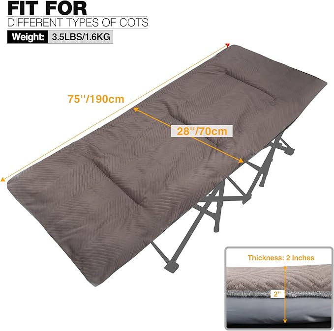 - Lightweight and Portable: These sleeping cot mattress pad for camping measures 75x30 inches, long and wide enough for an adult to use. The thicker cot mattress weighs only 4 pounds, compacted into the included storage bag, easy to carry for outdoor travel, hiking, backpacking.