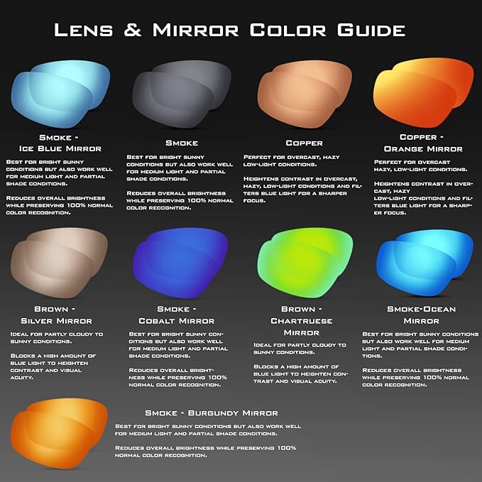 - Base Lens Colors – We offer three base lens colors; smoke, brown, and copper. Smoke lenses are ideal for bright sunlight and produce the most realistic color reproduction, but also work well in medium light and partial shade conditions. Brown lenses increase contrast and depth perception and work well for partly cloudy to sunny conditions. Copper lenses provide excellent contrast and depth perception and are best suited for moderate to low light conditions.
