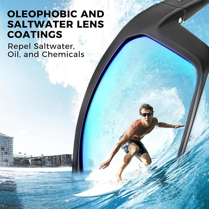 - KEY FEATURES – Oleophobic lens coating repels saltwater, oil, and chemicals - Polarized lenses reduce glare - Impact resistant TAC lenses protect your eyes from flying objects - Block 100% of the harmful UVA and UVB rays - Lightweight, durable, and comfortable Grilamid frames.