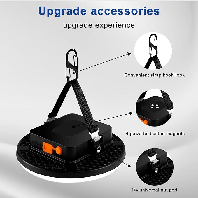- ๐ใConvenient to useใThis portable camping lantern comes with one detachable strap hooks,carabiner and magnet, at the base that can hang the tent light upside down to get better light when lighting up a big area.A 1/4nut port on bottom,which could help you use the tripod or other extended tool.The Improvement 4XN42 magnet could adsorbed on any surface of metal.Also come with a canvas drawstring pocket for you to carry your light everywhere.