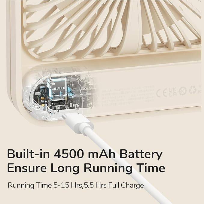 - Cordless and Rechargeable: This travel fan has a built-in 4500mAh energy-saving battery, which is not anxious for going out, with a battery life of up to 13 hours, it's not only a great desk accessory, but also a cruise essential gadget