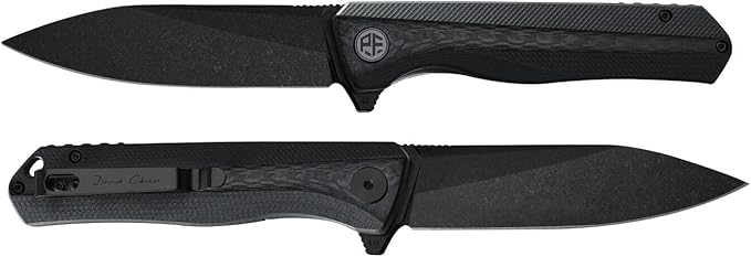 - 【Outdoor Folding Knife Materials】The blade is made of D2 tool steel with high wear resistance. After heat treatment, its hardness can reach 60HRC. It is a kind of steel suitable for practical use, which can meet any needs of people when camping or working. The handle is Carbon Fiber with G10 material with strong anti-deformation ability. It does not absorb water and will not be affected by moisture, so you never have to worry about the influence of water on the handle.