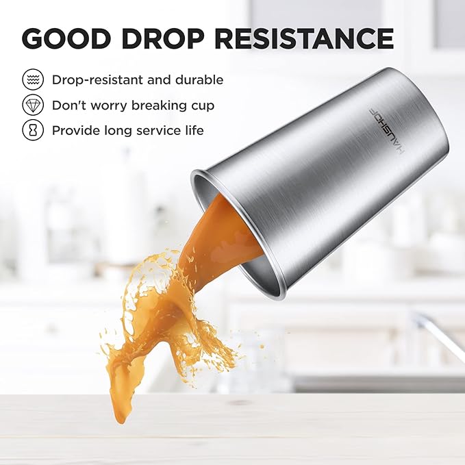 HAUSHOF Pint Cup, 16 oz Stainless Steel Cups, Stackable Metal Drinking Cups, Stacking Beer Pint Cups for Home, Party, Camping, Outdoor, Unbreakable, 4 Pack
