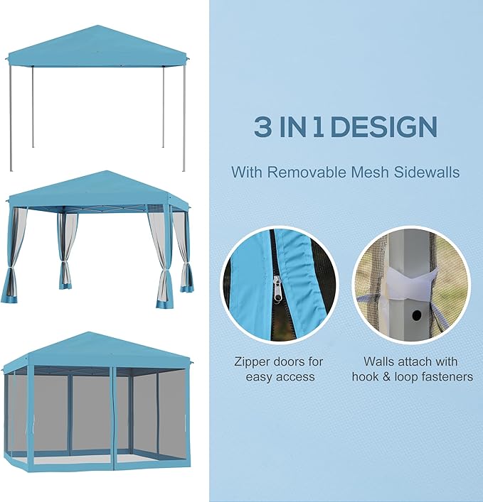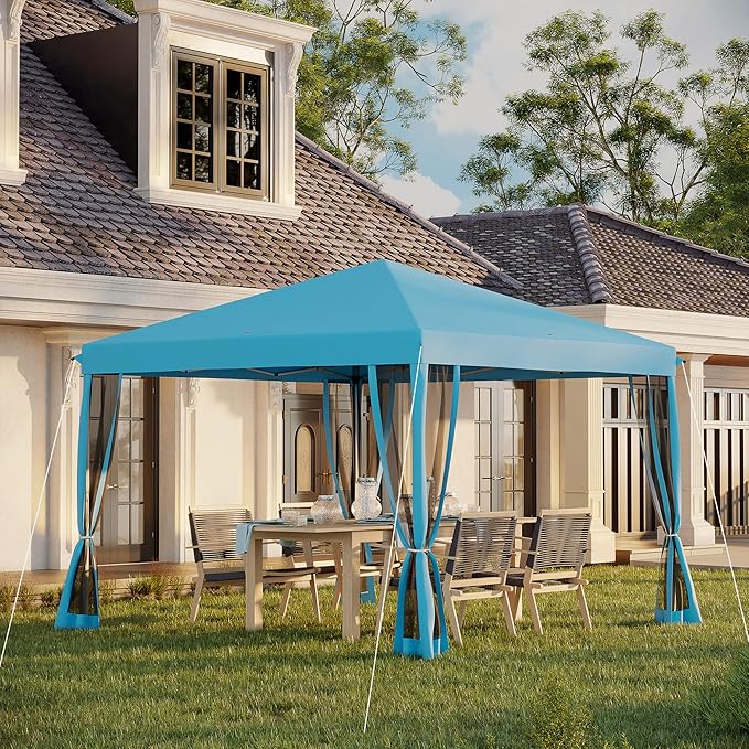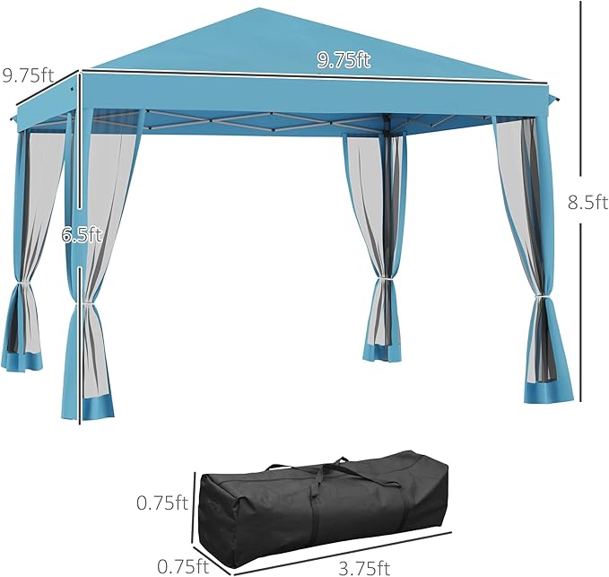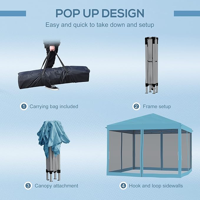 Outsunny 10' x 10' Pop Up Canopy Tent with Netting, Instant Gazebo, Screen House Room with Carry Bag, Height Adjustable, for Outdoor, Garden, Patio, Camping, Light Blue
