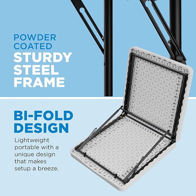 - HEAVY DUTY STURDY & STABLE - Lightweight and portable, this plastic folding table features an impact-resistant resin surface, waterproof & easy to wipe clean, and is supported by a heavy duty steel framework. The reliable anti-arch lock keeps it steady and stable on any indoor or outdoor surface.