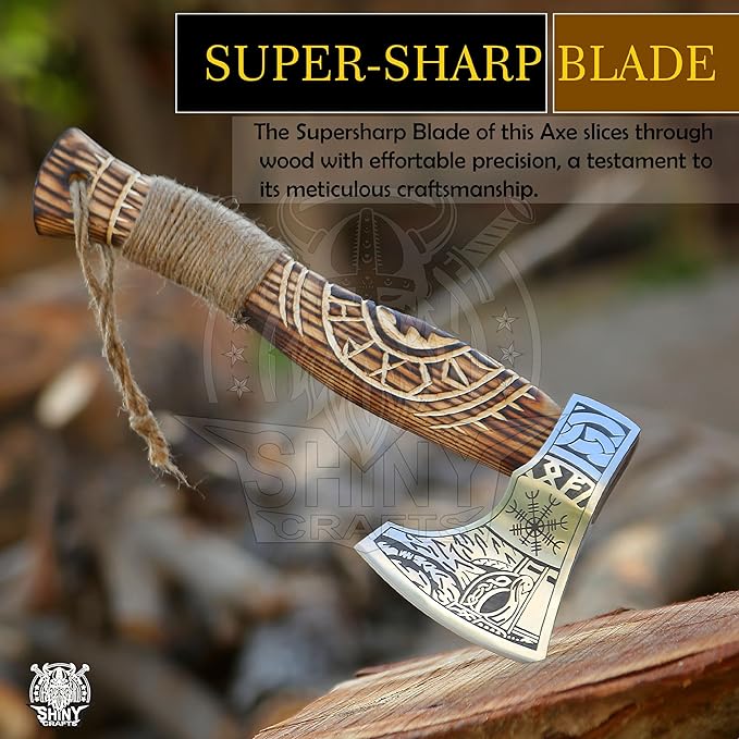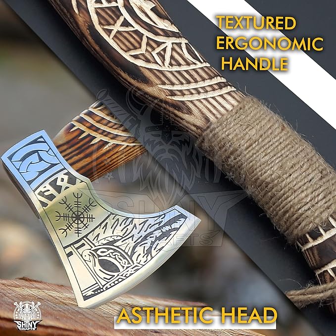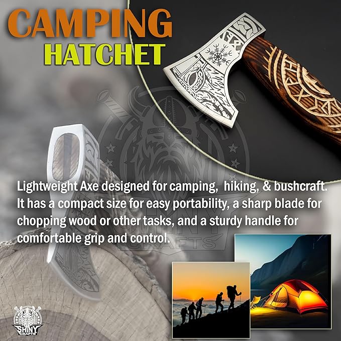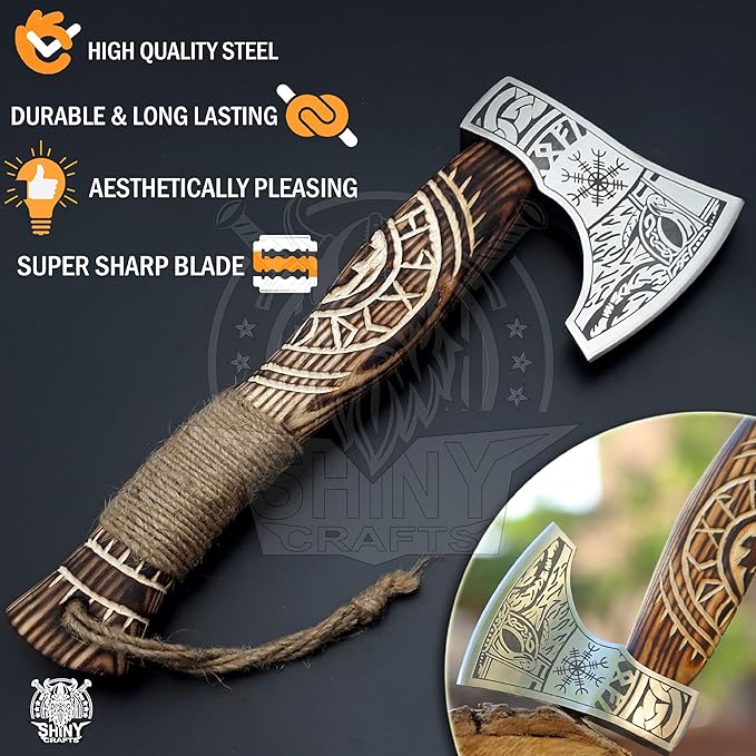 - ✅SHINY CRAFTS Certainly, here's the information of-Viking Axe, hatchet axes, throwing axes, and tomahawks Valhallah- Highly rated 19'' VIKING AXE SPECIFICATIONS - High Quality 1095 Carbon steel semi sharp blade width 5'' inches, length 6'' inches and Rosewood Handle 19'' with Prefect Grip and Balanced Axe.