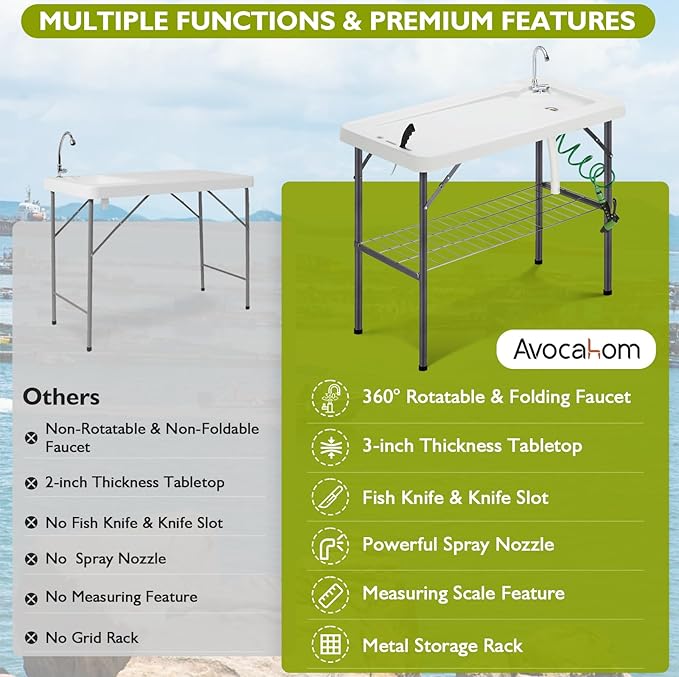 - Practical Details Design:Quick-connect faucet that can be hooked to a garden hose easily. Besides, our fillet table for fish is equipped with a stable grid rack and an extending sprayer to provide water pressure where you need it. Our table features scale on the side of table as reference for specialty and customized fillets. It also comes with three knife groove and a knife.
