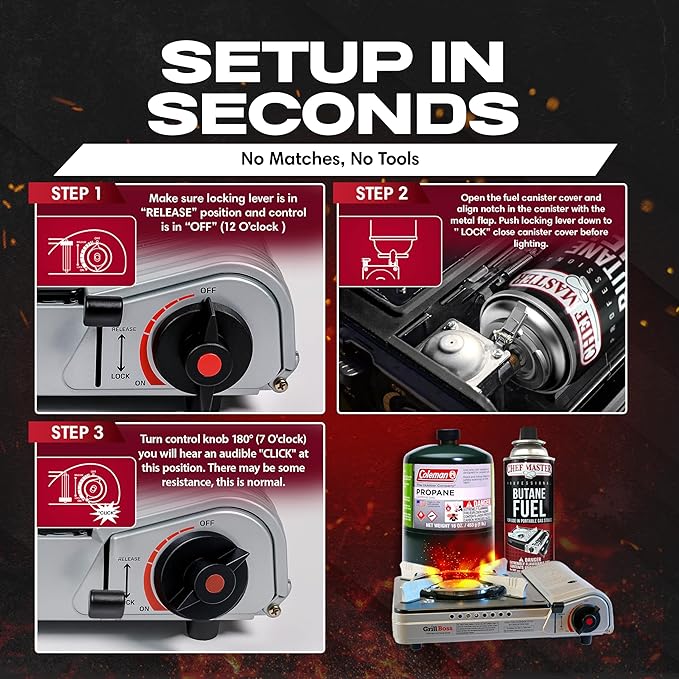 - COMPACT & TRAVEL-READY CAMP STOVE FOR EVERY ADVENTURE – Take outdoor cooking to the next level with the Grill Boss Butane Camp Stove, your reliable partner for camping, hiking, backpacking, tailgating, and emergency situations. Lightweight and compact, this stove stores neatly in a durable hard-shell carrying case for easy transport and protection. Whether you're setting up at a remote campsite or cooking on the move, this dual-fuel stove is built to deliver consistent, dependable heat.