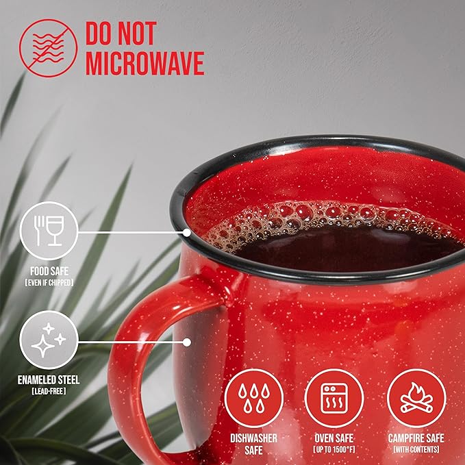 - This is a classic mug design, with a smooth, enameled red coating, black rim, and fine white splatter design to complement vintage, rustic, antique, cottage, farmhouse, and country décor