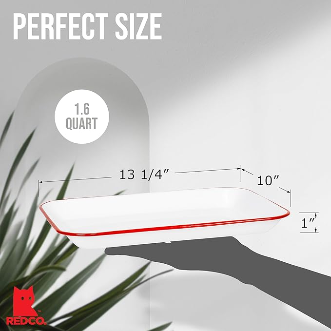 Red Co. 13.5” x 10” Enamelware Metal Classic 1.6-Quart Rectangular Serving Tray, Solid White/Red Rim