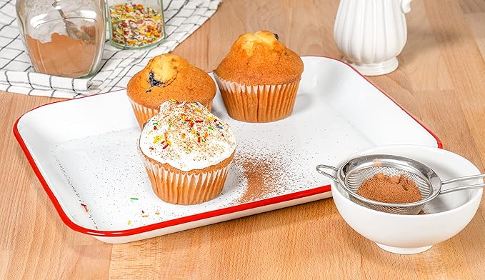 - Features a rectangular shape with a smooth, enameled white surface, and red rim to perfectly complement vintage, shabby chic, antique, cottage, farmhouse, and country living décor