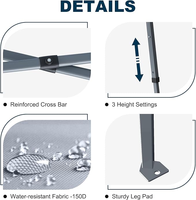 - Convenient and Portable: Designed of 2-section telescopic legs, which makes it convenient to adjust the height of the canopy,easily folded and packed into the wheeled bag, which makes it easier to carry and transport the canopy.